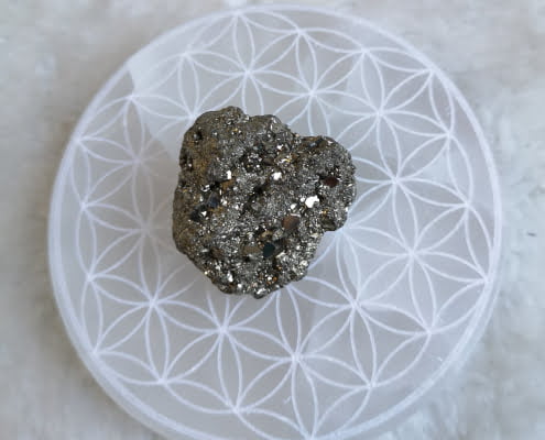 * okrogla selenitna ploščica z rožo življenja + pirit